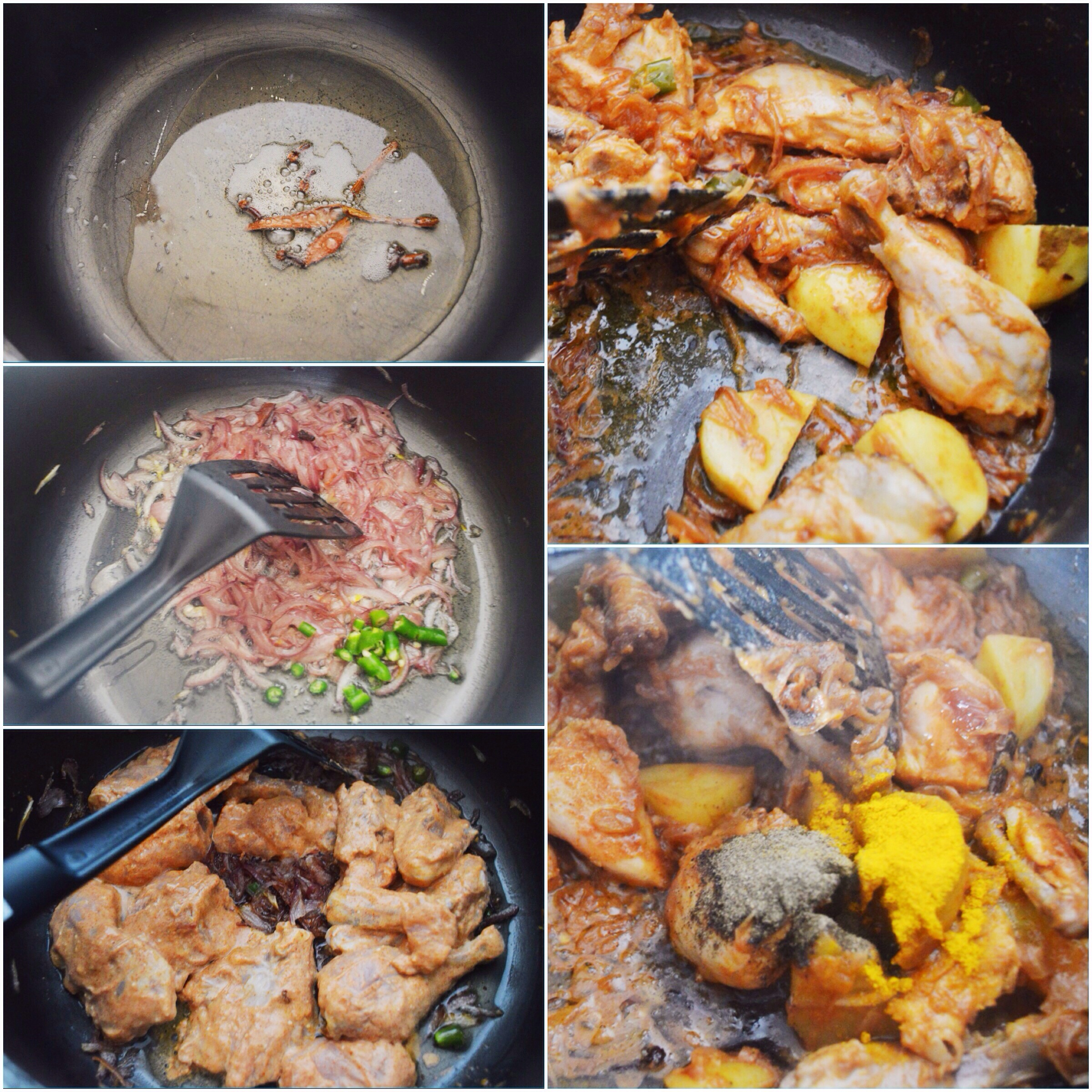 - Separate as much marinade from the chicken as possible. Save the marinade & add the chicken pieces to the pan; Toss well along with the spices & onions & close the lid and cook for 5 mins.