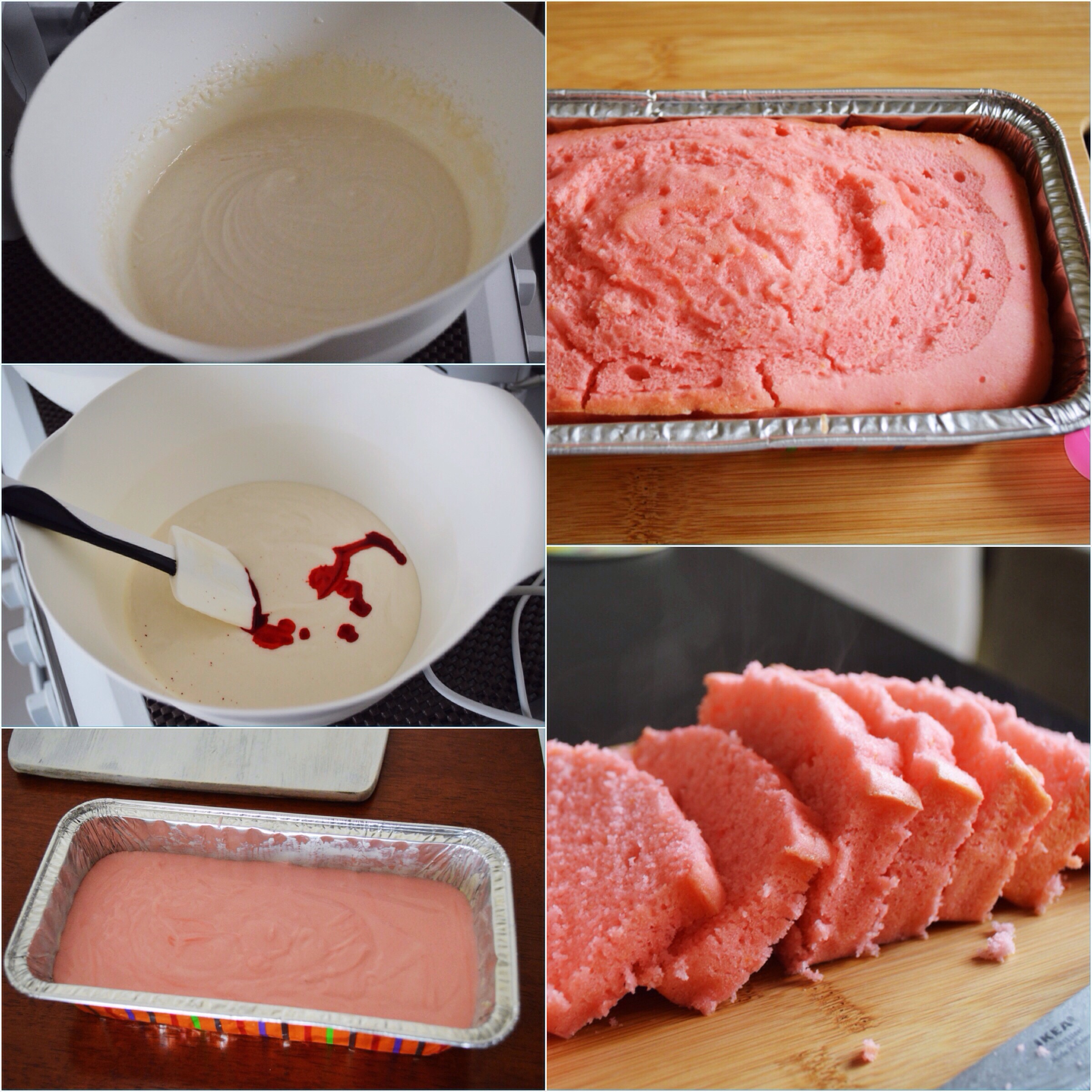 - Take out 1/3rd of the batter out and mix in 3-4 drops of red food color to it.