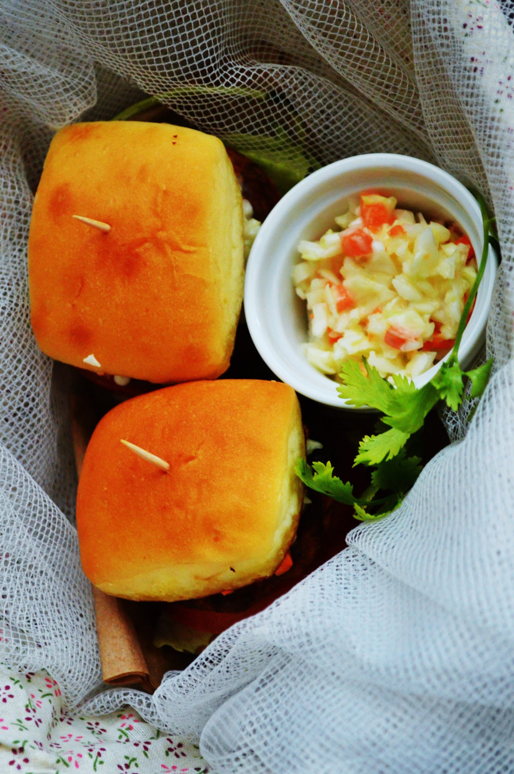 - To serve, slice the buns in half and toast them with olive oil. Keep the lettuce and tomato on one side of the bun and then the patty and then spread the coleslaw on top of the patty before covering with the other half and passing a burger skewer through the entire bite sized burger.