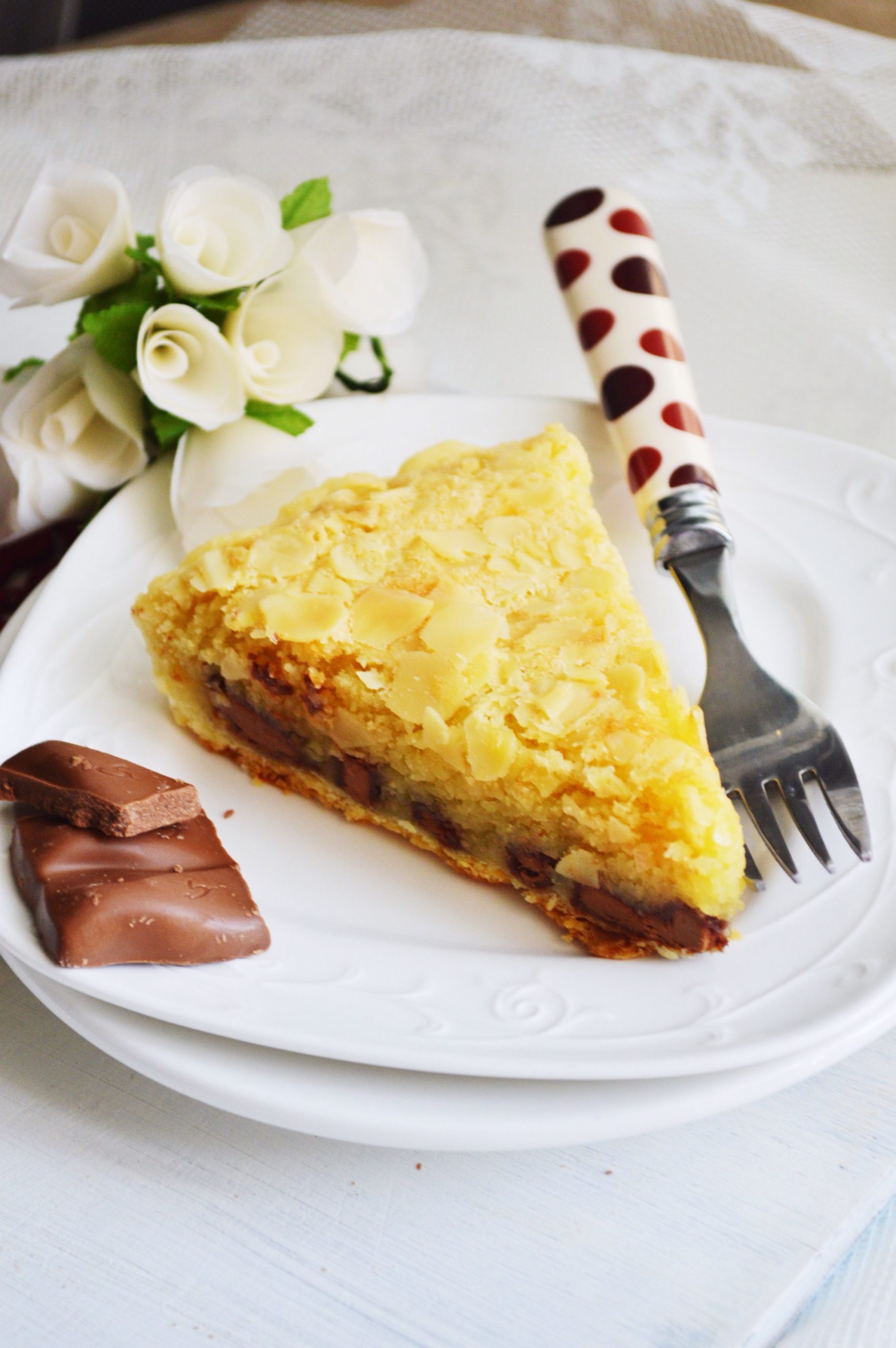 - Add the chopped chocolate on the crust. Pour the almond cream. Sprinkle sliced almonds.