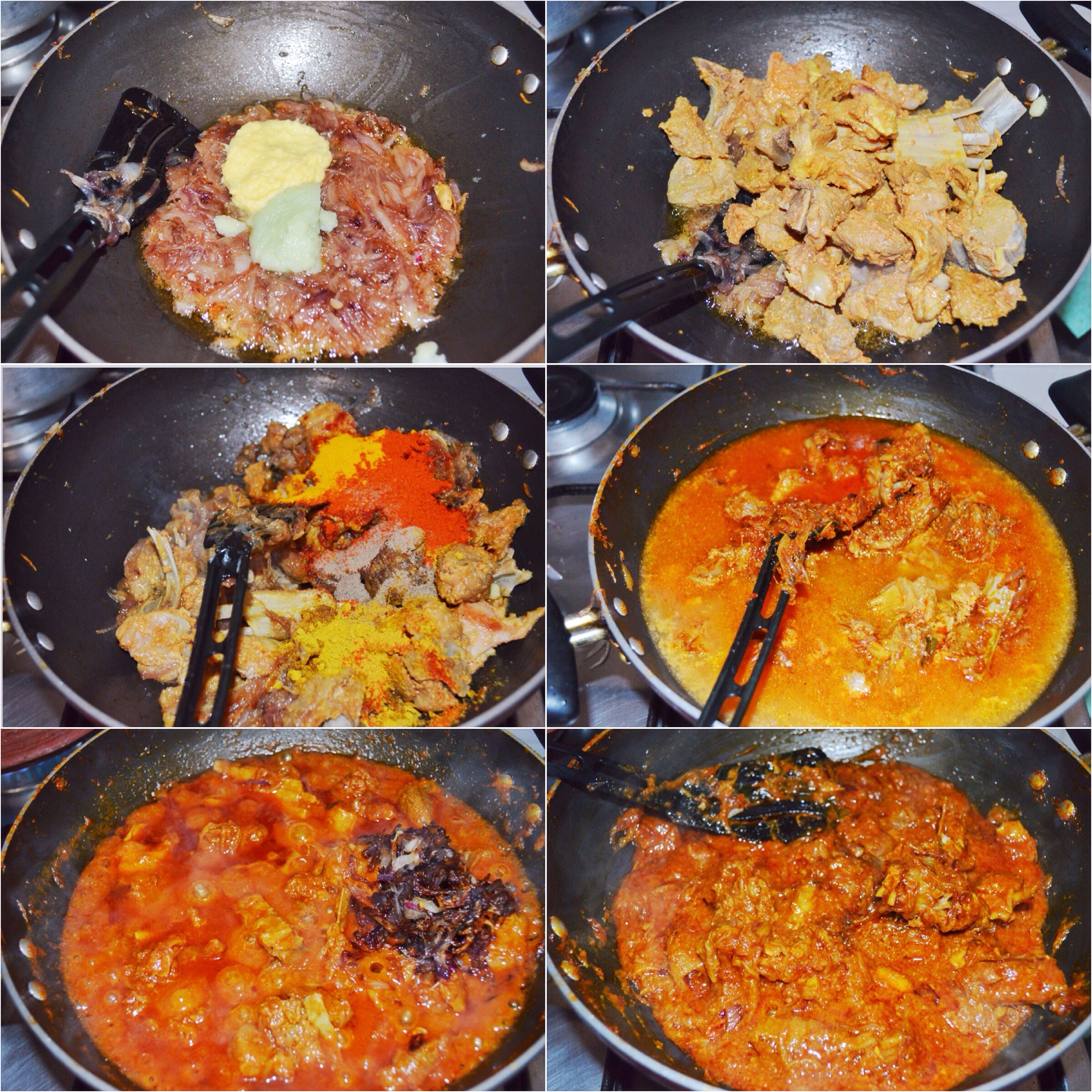 - Add in the turmeric, coriander, chilli and black pepper powders. Mix well and cook for 5-7 mins until the meat and onion mix blends well. Now start adding the reserved sauce little by little so that the onion mix wont dry out and stick to the bottom. When all the reserved liquid is used up and the onion mix looks kinda like a paste with oil separating from the sides, it is time to cover it and cook further for the meat to get tender.