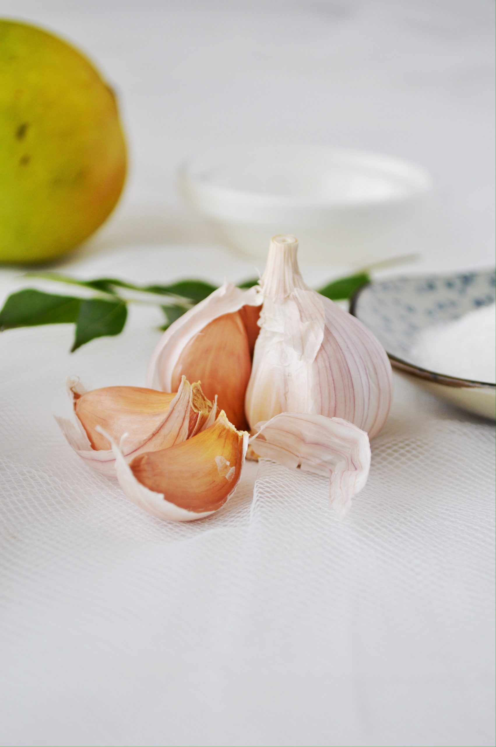 1. Chop the mangoes, garlic, green chillies, and curry leaves really fine. I just chopped everything together in my hand blender.