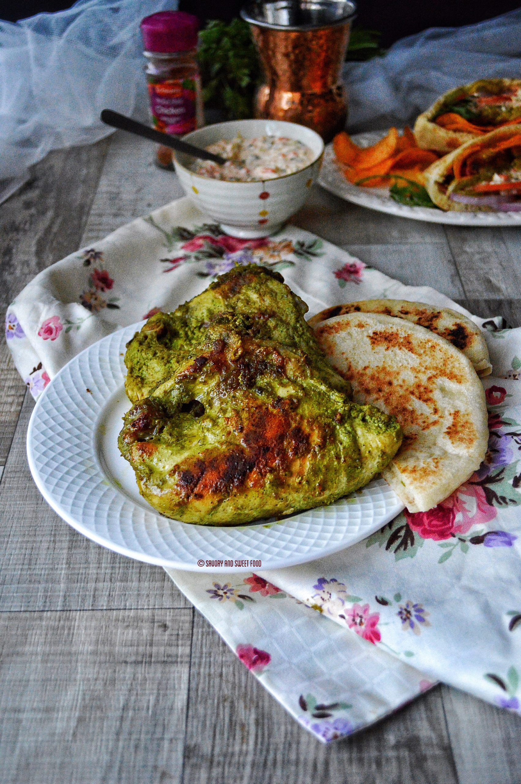 Grind all the ingredients listed under marination till you get a smooth paste and add it to the chicken. Let it marinate for 2 hours. - Heat a griddle pan, add some olive oil and grill the chicken till done.
