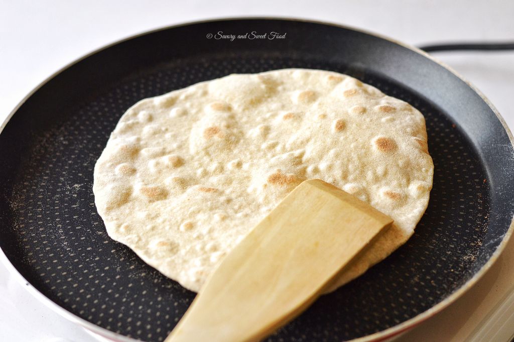 7. The pan should be really hot while adding the chappathi. Then after flipping it reduce heat to medium and after last flip increase heat to high for chapati to put up well. There are two flips in total. Check the directions.