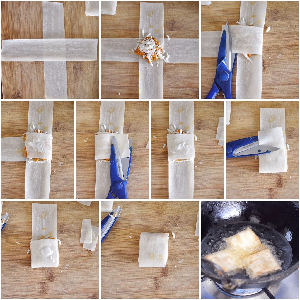 - Cover the filling by flipping one side of the sheet. Cut the excess sheet off. Spread a little amount of paste on top of the folded side.