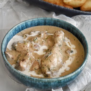 This is a mild, creamy white chicken curry made with yogurt, cashews and fresh cream.